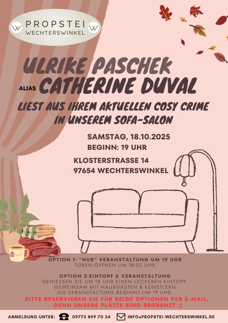 Samstag, 18. Oktober 2025 – 19 Uhr Lesung von Ulrike Paschek alias Catherine Duval in unsere Sofa-Salon Infos & Inhalte Ulrike Paschek liest aus Ihrem