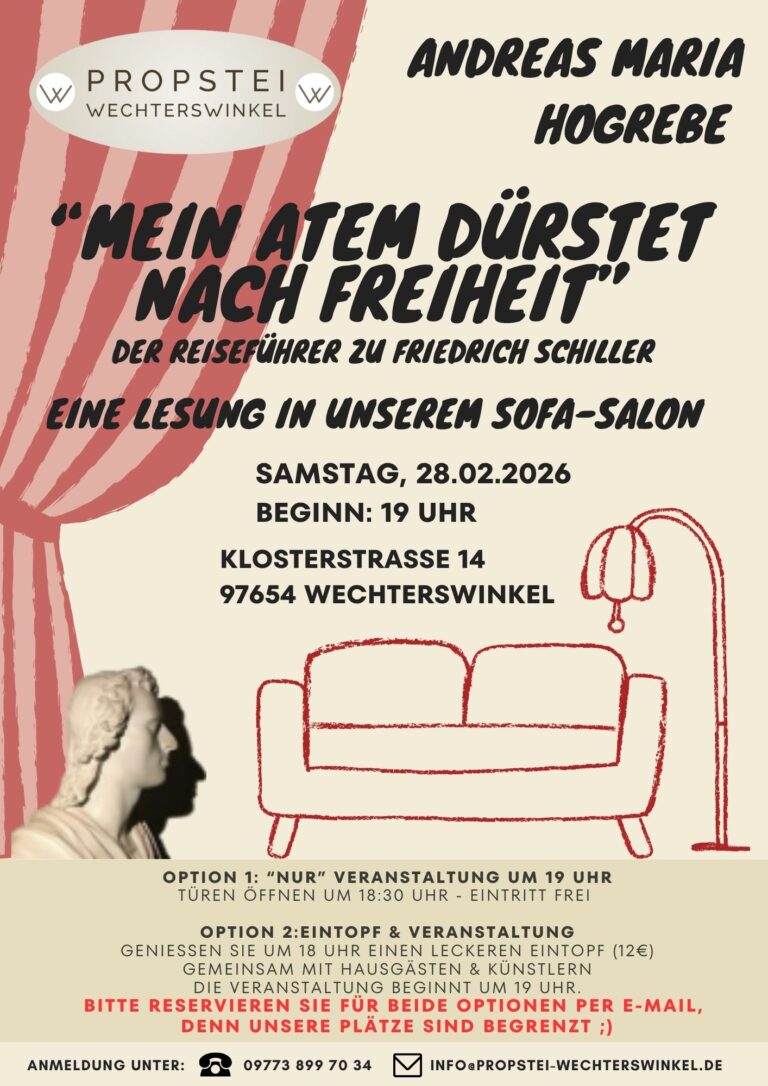 Samstag, 28. Februar 2026 – 19 Uhr „Mein Atem dürstet nach Freiheit“ Der Reiseführer zu Friedrich Schiller Eine Lesung von Andreas Maria Hogrebe in unserem