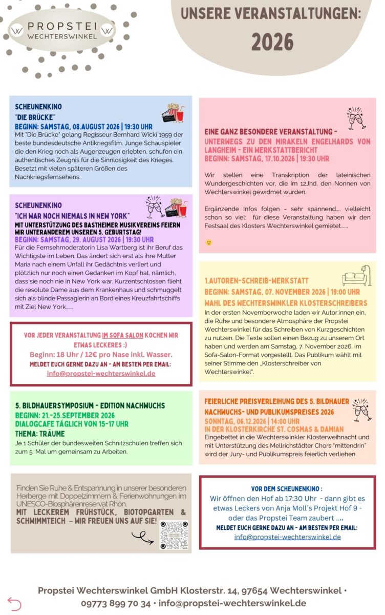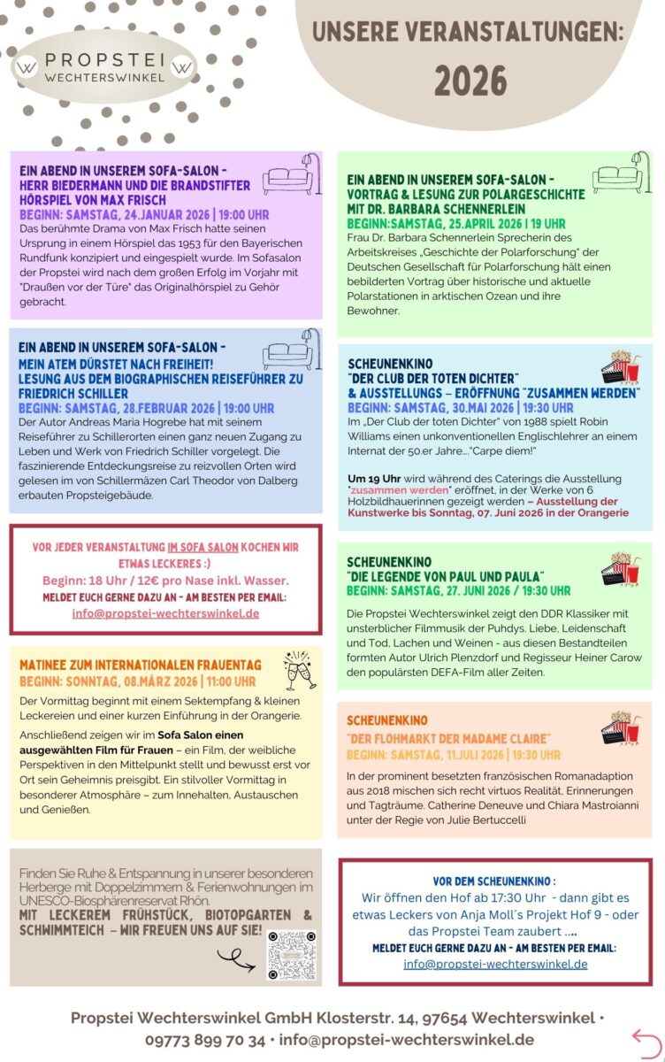 Erleben Sie bei uns in der Propstei Wechterswinkel eine bunte Mischung an kreativen und exklusiven Kulturveranstaltungen. Schauen Sie selbst; im Scheunenkino und Sofa-Salon ist bestimmt etwas Passendes für Sie dabei 😉