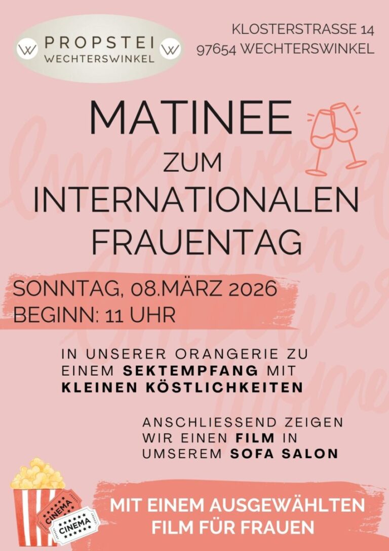Sonntag, 08. März 2026 Matinee zum internationalen Frauentag Mit Sektempfang in unserer Orangerie & einem ausgewählten Film für Frauen in unserem Sofa Salon