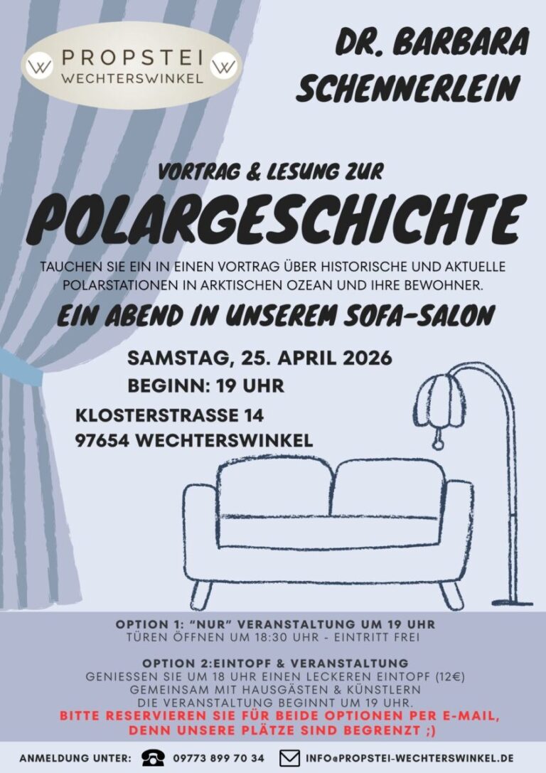Samstag, 25. April 2026 – 19 Uhr Vortrag & Lesung zur Polargeschichte mit Dr. Barbara Schennerlein in unserem Sofa-Salon Infos & Inhalte Ihr Sitzplatz
