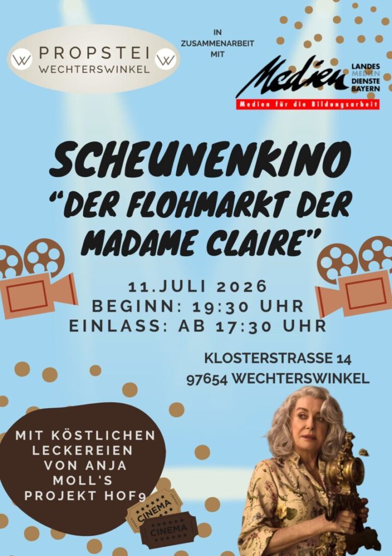 Samstag, 11. Juli 2026 – 19:30 Uhr Scheunenkino „Der Flohmarkt der Madame Claire“ Infos & Inhalte In der prominent besetzten französischen Romanadaption aus 2018 mischen