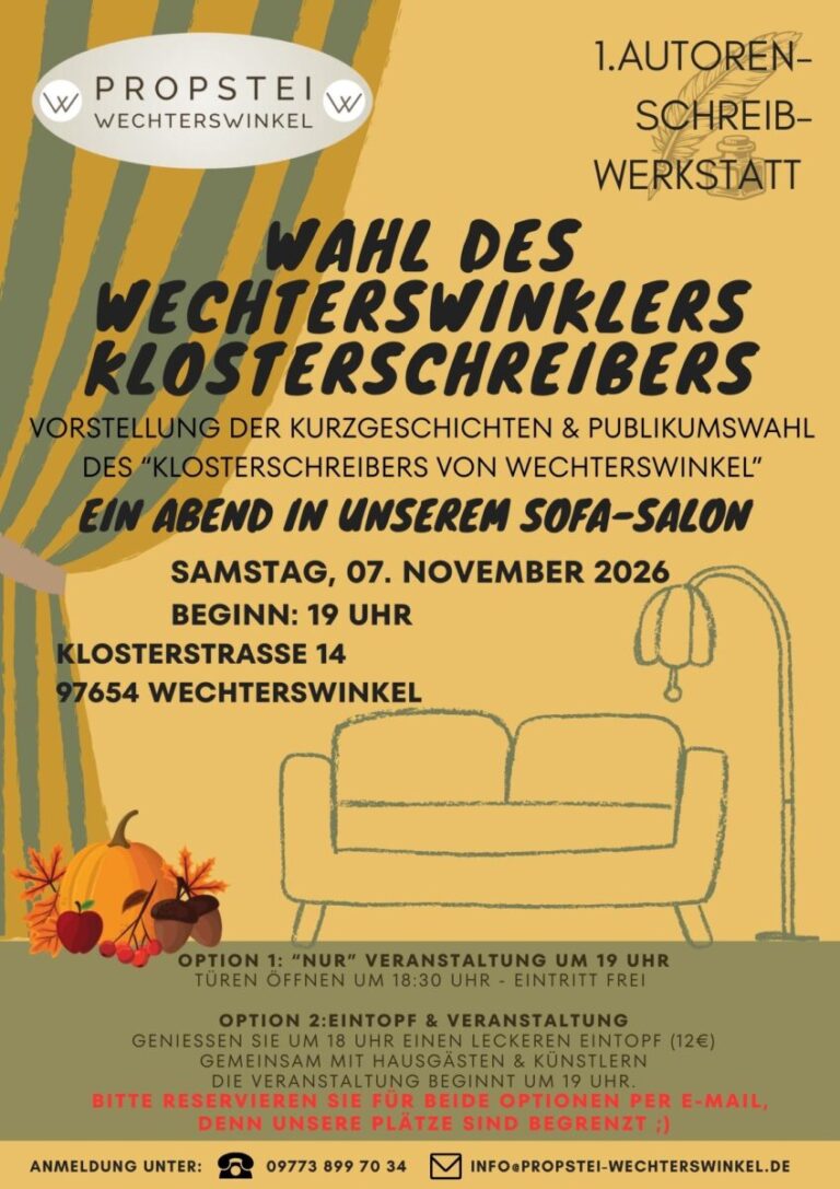 Samstag, 07. November 2026 – 19:00 Uhr 1.Autoren-Schreib-Werkstatt Wahl des Wechterswinkler Klosterschreibers in unserem Sofa-Salon Infos & Inhalte In der ersten Novemberwoche laden wir Autor:innen