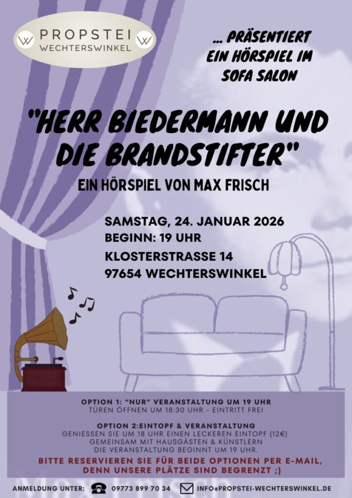Das berühmte Drama von Max Frisch hatte seinen Ursprung in einem Hörspiel das 1953 für den Bayrischen Rundfunk konzepiert und eingespielt wurde. Im Sofasalon der Propstei wird nach dem großen Erfolg im Vorjahr mit „Draußen vor der Türe“ das Originalhörspiel zu Gehör gebracht.